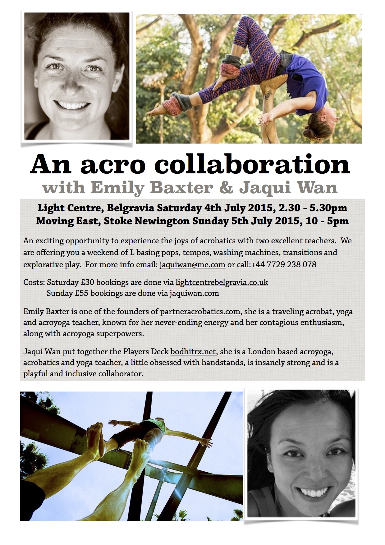 An exciting opportunity to experience the joys of acrobatics with two excellent teachers.  We are offering you a weekend of L basing pops, tempos, washing machines, transitions and explorative play.