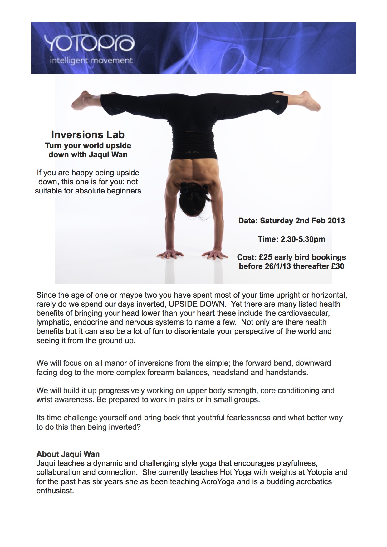 I have learnt to enjoy being upside down, to play with the laws of gravity. For those of you out there into physiology there are numerous benefits to being upside down which include: –