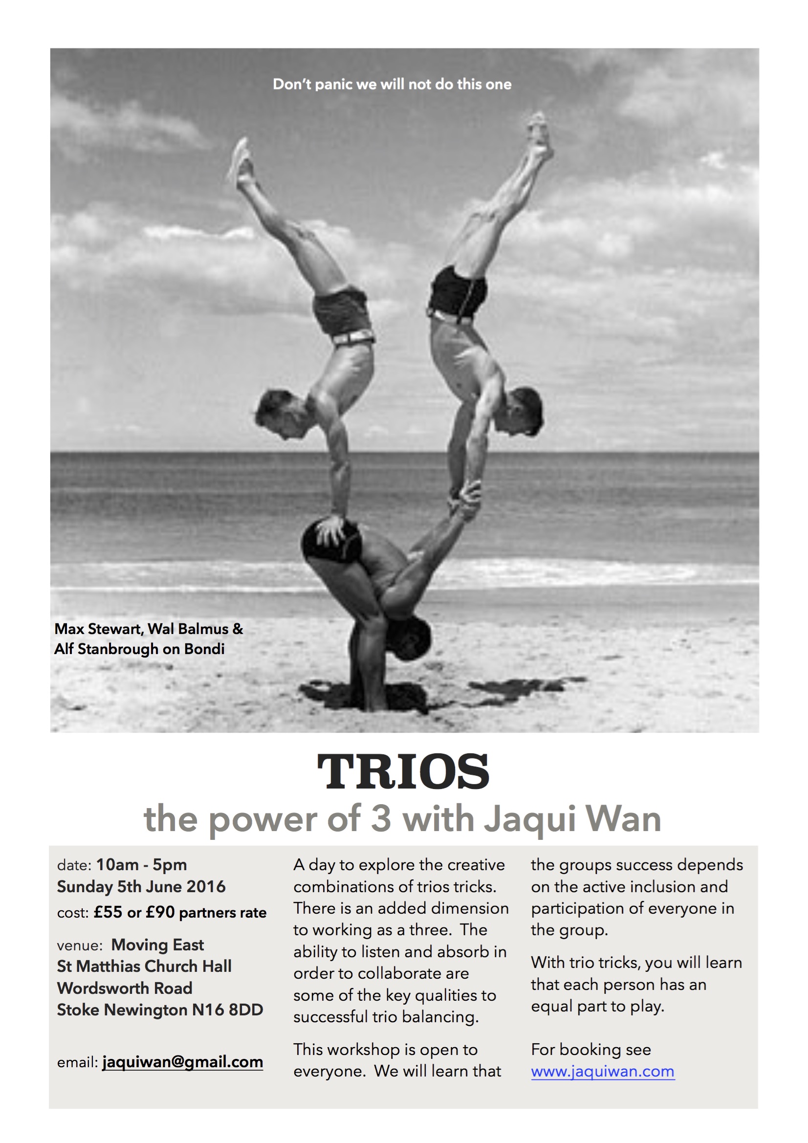 This afternoon’s workshop is open to all at Flying Fantastic, we will focus on the wisdom of acrobatic principles, alignment techniques and strength elements that progress into basic partner balancing, cultivating trust, strength and flexibility whilst working as a team.