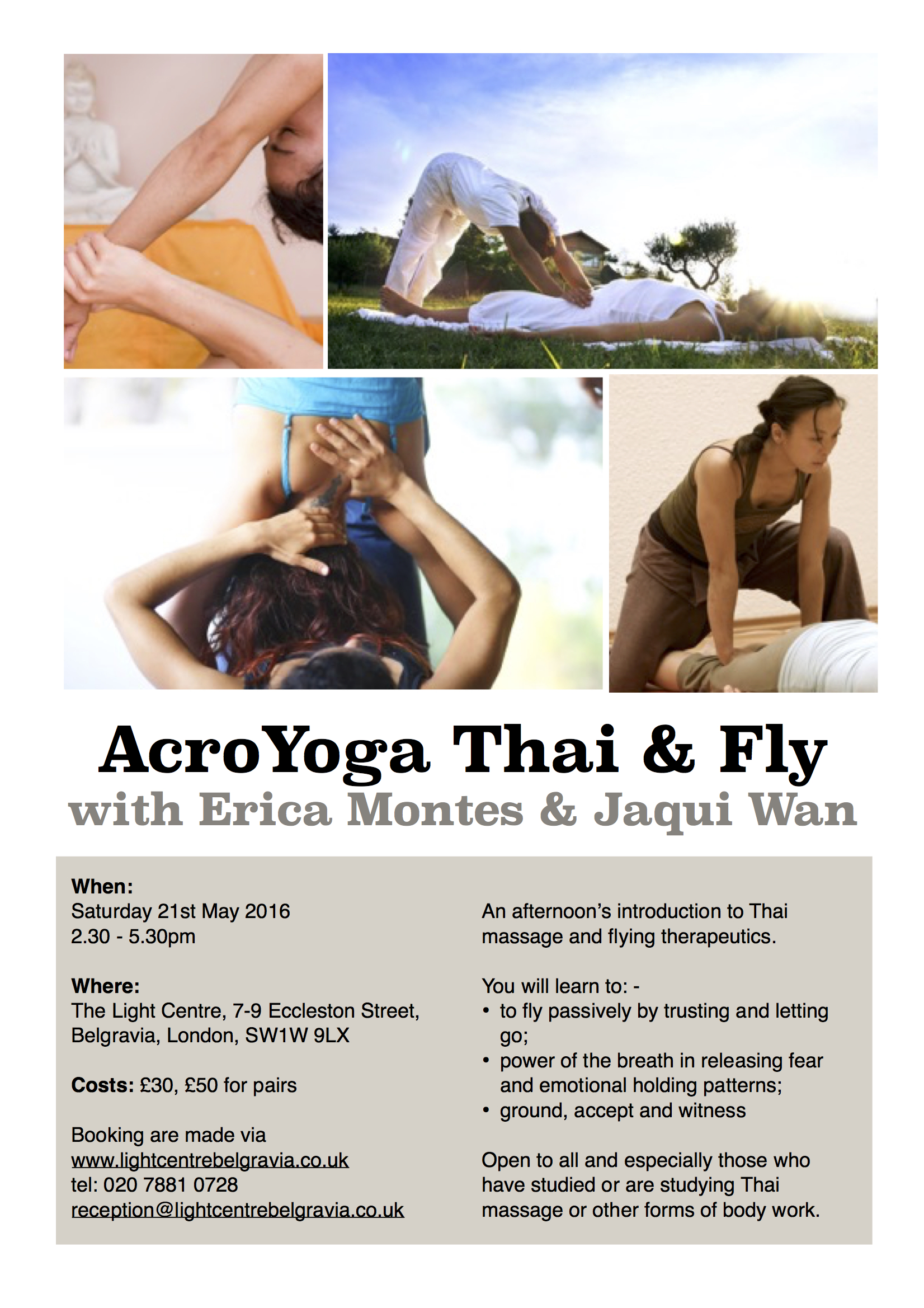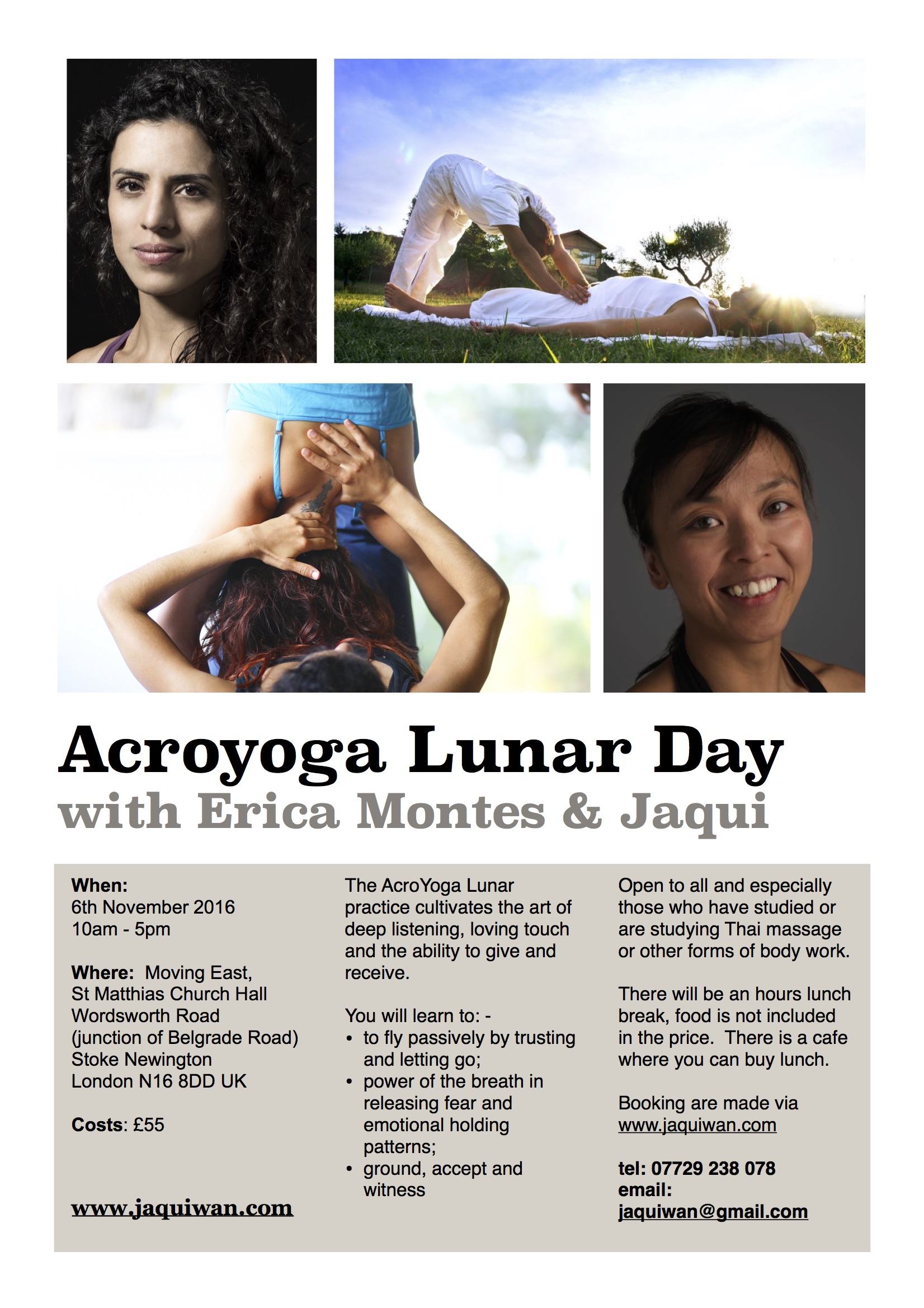 The workshop will introduce you to partner yoga, suspended therapeutics; where you will explore the roles of inactive flying and listening supportive basing. We will also present the healing qualities of sensitive touch in Thai massage. All the material covered are taken from the Lunar Elements within the practice of AcroYoga.